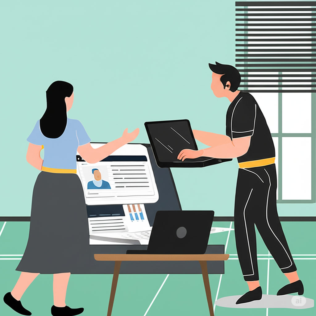 Máy tính xách tay bên trái hiển thị giao diện người dùng đơn giản, có biểu tượng ảnh chân dung được viền màu xanh, một số dòng văn bản nằm ngang và biểu đồ thanh nhỏ với các thanh màu đỏ, trắng và xanh nhạt. Một hình người bên trái, với mái tóc đen dài, đang mặc áo sơ mi xanh nhạt, váy xám có cạp quần màu vàng và giày đen, đang ra hiệu tích cực về phía màn hình máy tính xách tay.
