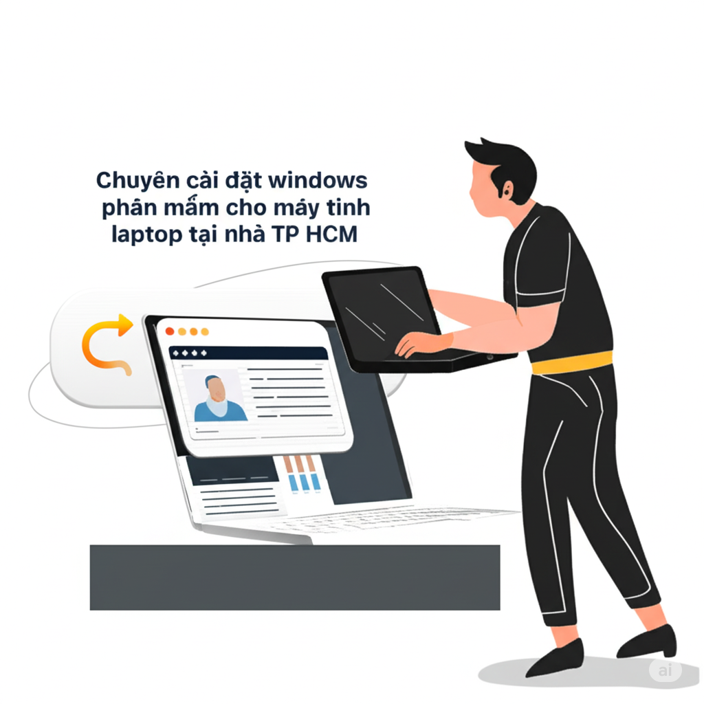Đằng sau chiếc máy tính xách tay lớn, có thể nhìn thấy biểu tượng đám mây màu trắng cách điệu với mũi tên cong màu cam hướng về phía máy tính xách tay, gợi ý về dịch vụ đám mây hoặc truyền dữ liệu. Nền là màu xám nhạt/trắng đục đơn giản, tạo nên môi trường sạch sẽ và gọn gàng. Tổng thể thẩm mỹ nhấn mạnh vào các dịch vụ kỹ thuật số, cài đặt phần mềm và hỗ trợ CNTT.