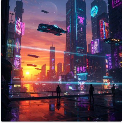 Cảnh quan thành phố tương lai ngoạn mục lúc hoàng hôn, được thể hiện theo phong cách cyberpunk cực kỳ chi tiết.
