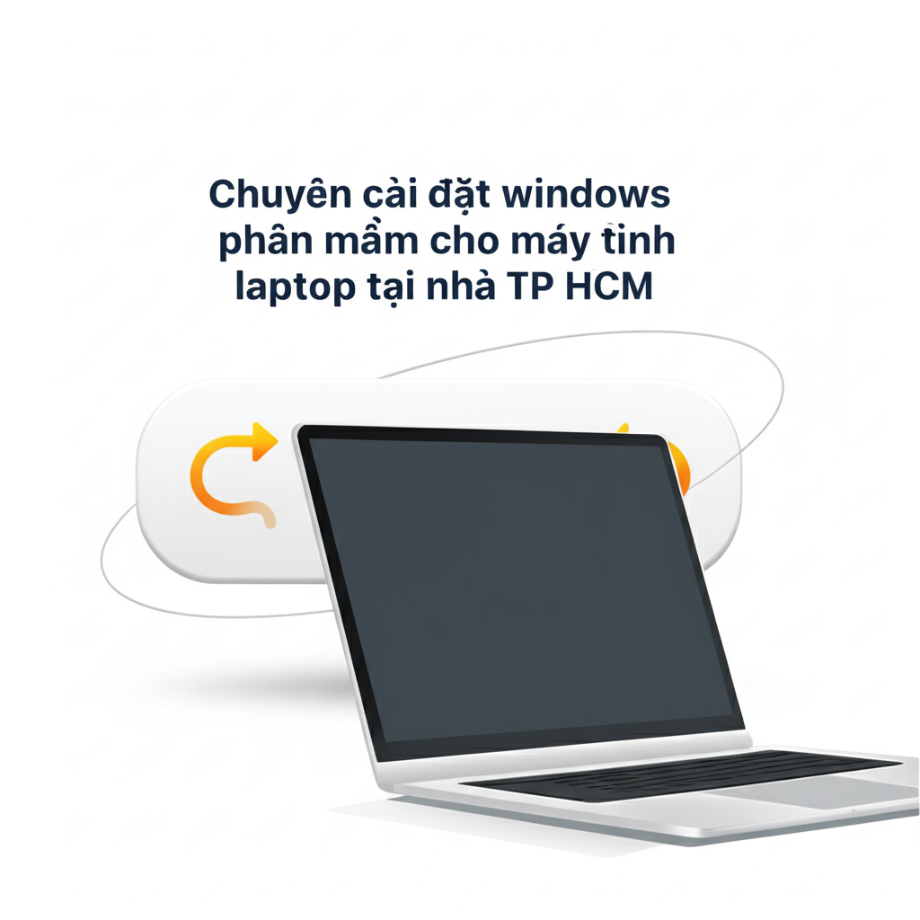 Phía sau máy tính xách tay, có một đám mây trắng lớn, cách điệu với một mũi tên cong màu cam nổi bật hướng từ phía bên trái của đám mây về phía máy tính xách tay, biểu thị việc truyền dữ liệu, dịch vụ đám mây hoặc đồng bộ hóa. Các đường mỏng, màu xám nhạt kéo dài từ đám mây, kết nối tinh tế với máy tính xách tay.